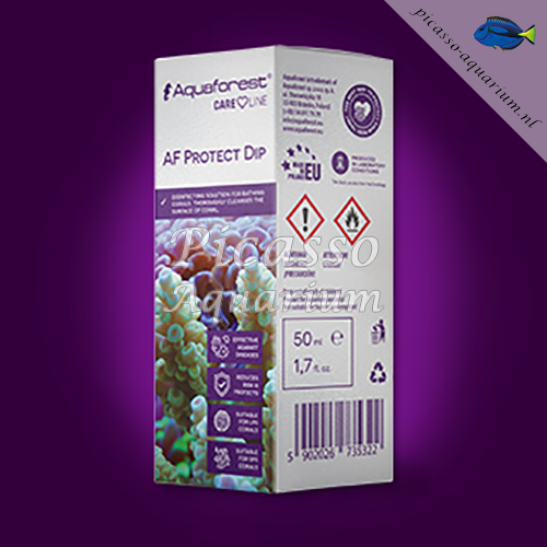 Aquaforest Protect Dip is een koraaldip (ontsmettingsoplossing) voor koralen. Reinigt grondig het oppervlak van koraal. Vermindert het risico op het ontwikkelen van vele ziekten, voorbeelden: weefselnecrose, koraalbleking, mycosis, AEFW of Brown Jelly-syndroom.
