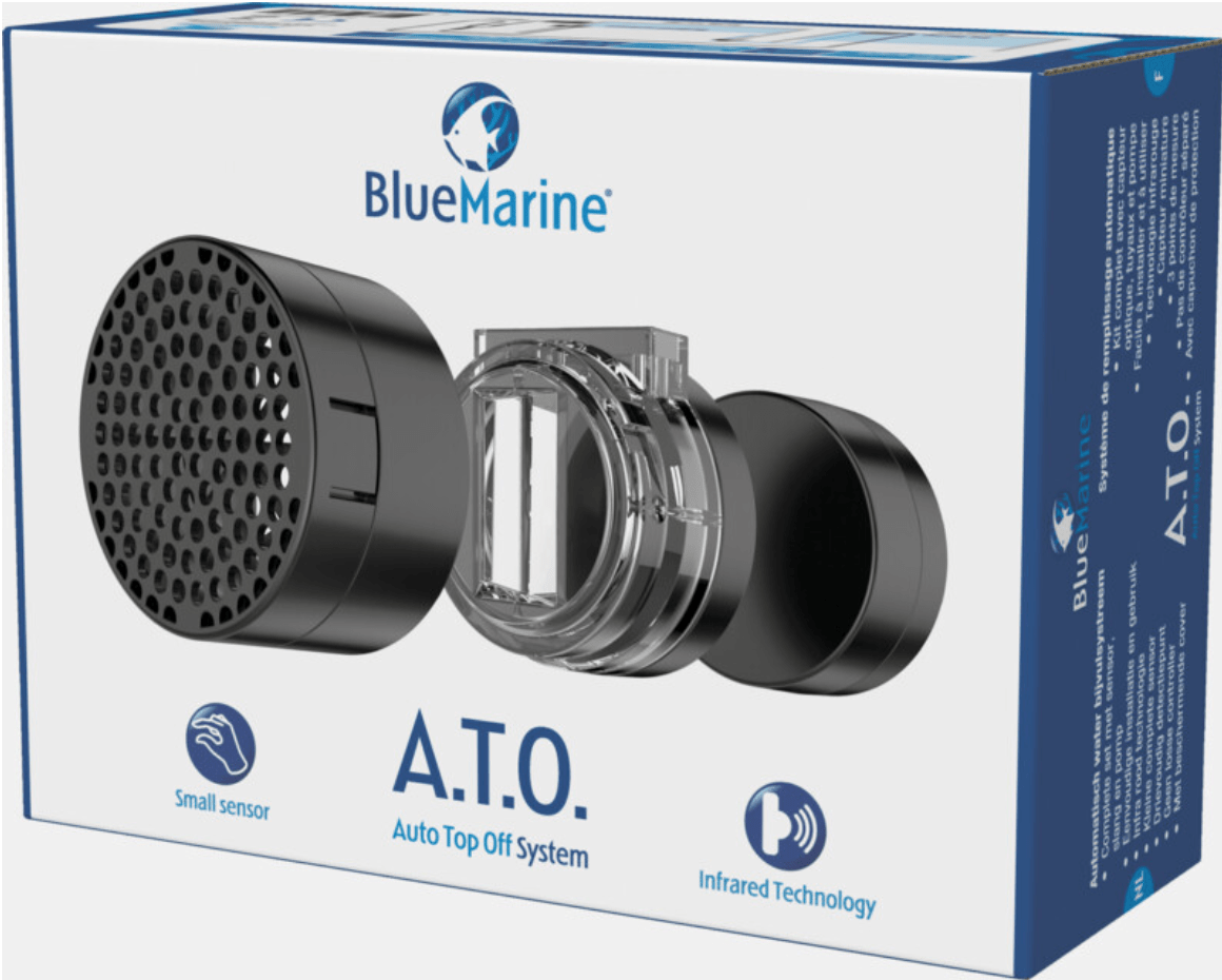 Met de Blue Marine A.T.O. u kunt uw aquarium of sump automatisch bijvullen. De set is compleet met een infraroodsensor, slang en pomp. De kleine sensor wordt in het aquarium of de sump geplaatst. Als het water in het aquarium onder het minimumniveau komt, schakelt de sensor automatisch de kleine pomp in, die het aquarium zal bijvullen met water uit een reservoir. De sensor heeft een drie detectiepunten en een indicator (LED-lampje) en een alarm (rood knipperende LED) in geval van problemen.usief veiligheidstransformator
